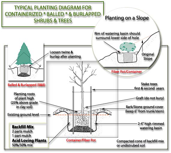 The success of a plant depends on proper installation and maintenance. Acceptable soil, sufficient water and adequate drainage are all necessary for plants to live. Some reading on modern planting techniques is recommended to help insure success.