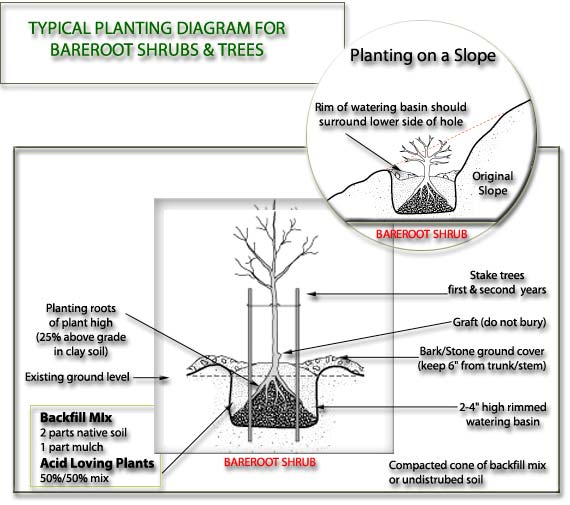 Plant bare root plants within 2 days of taking them home. If your bare root plant cannot be installed the same day it is taken home maintain in an area out of direct sun and protected from freezing — like a garage. Keep roots in plastic bag if present or heel in the ground at a temporary location. Keep roots covered and moist at all times!. Shredded, wet newspaper works if mulch is not available. Before planting, soak roots in a trash can or bucket filled with water for 30 –60 minutes or heavily saturate root-zone with water after planting.
